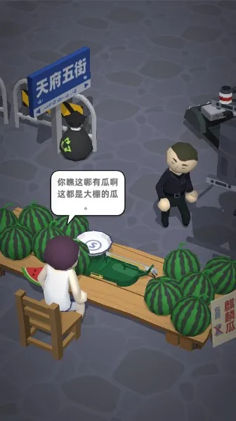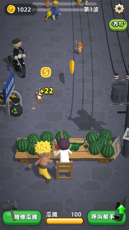玩法上,玩家可选择卖瓜人或买瓜人角色对战,买瓜人能召集帮手砸摊。玩家要从8个助手中召集4个,有70种我方阵容组合,面对源源不断的敌人攻击,看能坚持多久。操作简单易上手,在游戏里可召集人手,拿起武器展开精彩战斗。