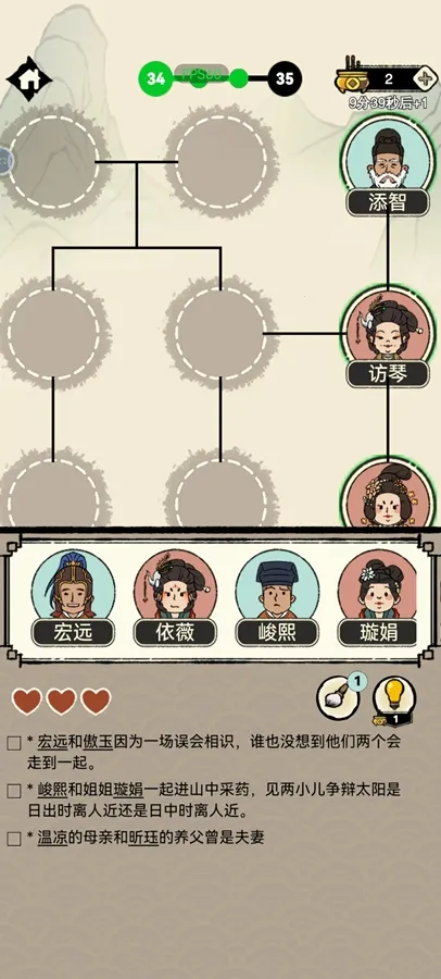 玩法上,关卡丰富需逐一挑战。修缮族谱时,按下方文字提示将人物头像拖入上方合适圆框,若不对应会扣血量,扣完则失败,所以要谨慎判断。还能点击右下角灯泡查看提示辅助。全部圆框填对即可通关获锤子奖励,收集足够锤子就能打造家园。