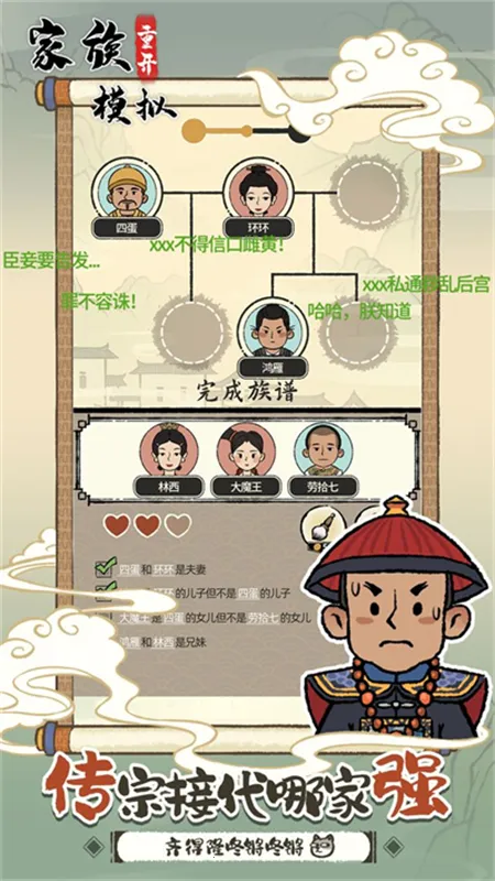 2、重建族谱玩法趣味十足,通过寻找族人关系线索并放置在合适位置,感受家族传承的魅力。