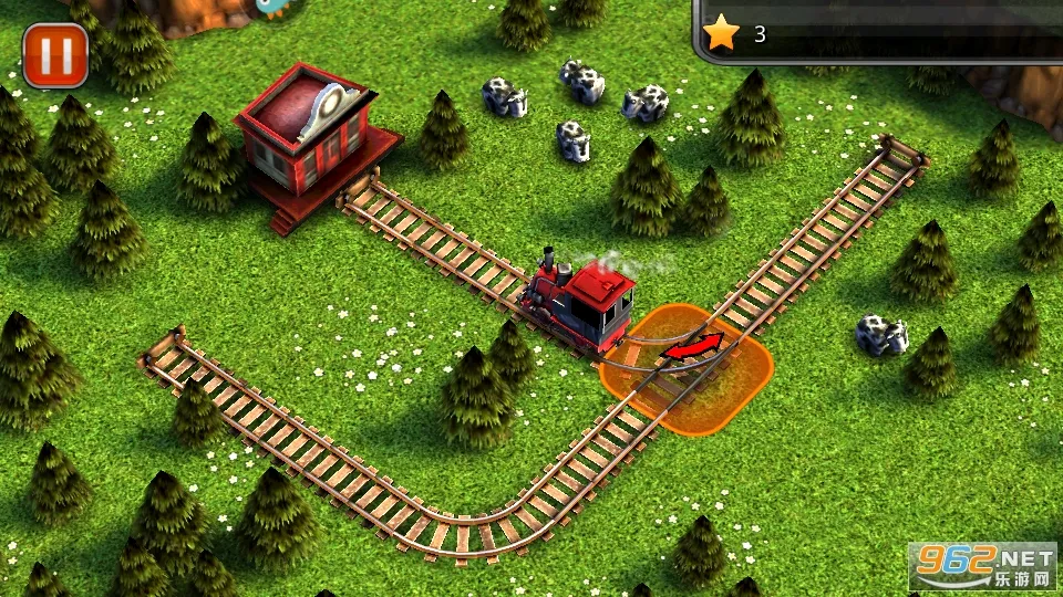 游戏音效贴合氛围,行进音效带来临场感,碰撞声与特效结合紧密。场景生动美观,铁路位于郊野,被丛林青山环绕,草皮木屋与小火车立体呈现,俯视视角便于观察全局。操作简单直观,入门有教程,轻触红色箭头就能改变火车路径。玩法富有新意,火车前进时玩家要迅速判断并引导至正确轨道,随着关卡推进,轨道布局更复杂,考验即时调度与顺序安排能力。