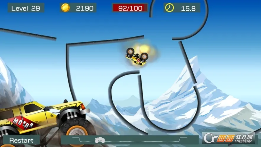 游戏特色鲜明。避免碰撞很关键,过多碰撞会损毁大脚车。在空中旋转360度能获额外奖励。支持挑战模式,可挑战关卡成绩好的选手。