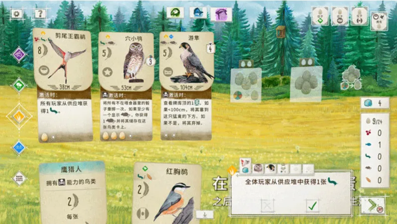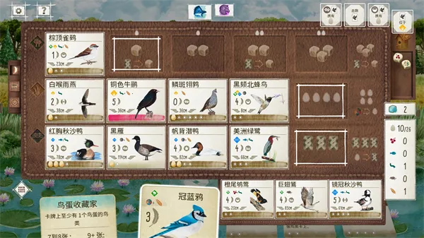 游戏中,玩家使用不同鸟类卡牌对战,还能搭配相关效果卡牌强化战斗力。每回合有四个阶段,在森林、平原、湿地等场景进行,获取食物、鸟类产蛋、抽取卡牌、打出卡牌。打出卡牌是得分主途径,还有产蛋、储存食物、激活特效等方式。
