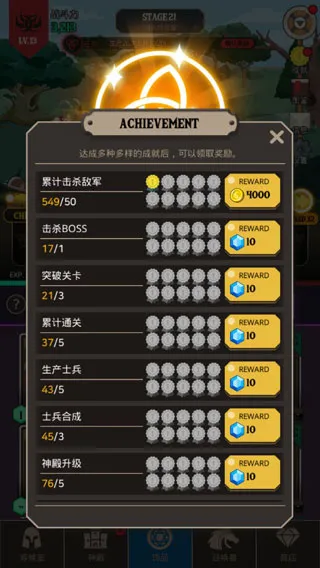 游戏玩法丰富。玩家用药水召唤士兵,拖动相同等级士兵合成可诞生新类型,放置战场战斗,战斗金币提升士兵等级。关卡冒险有强大哥布林与BOSS等待挑战。图鉴收藏与成就任务奖励增添乐趣。