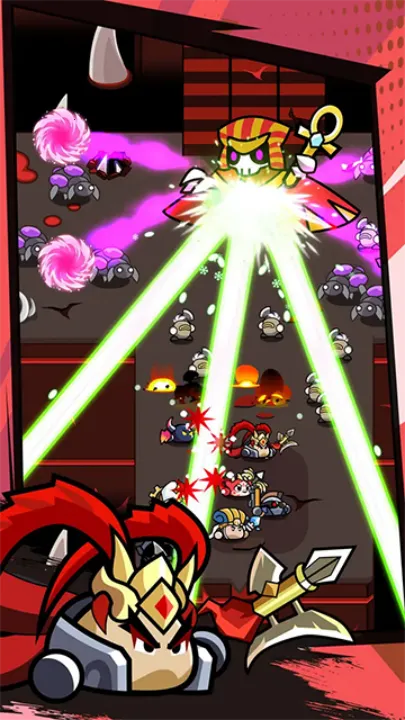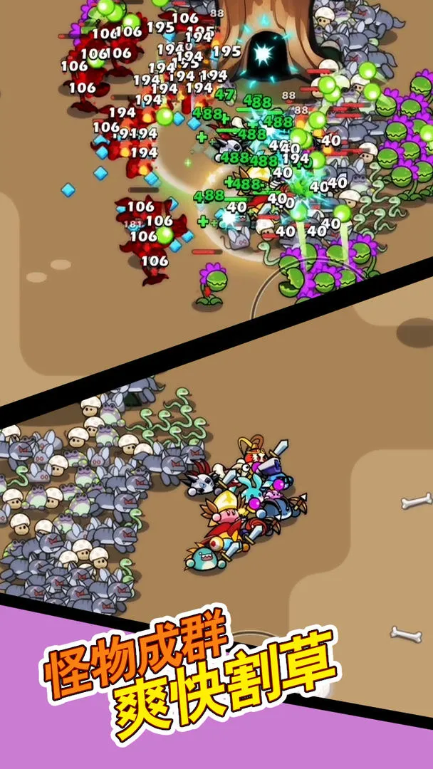 玩法上,滑动屏幕控制英雄移动,用肉资源解救同伴,角色未移动时自动攻击周围怪物,击败怪物获肉解救同伴。