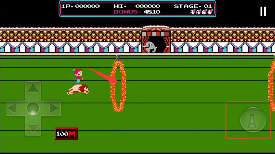 4、当遇到火圈类障碍时,点击跳跃按钮让角色跃过。成功穿过每个火圈都能获得相应分数,累积越多成绩越好。