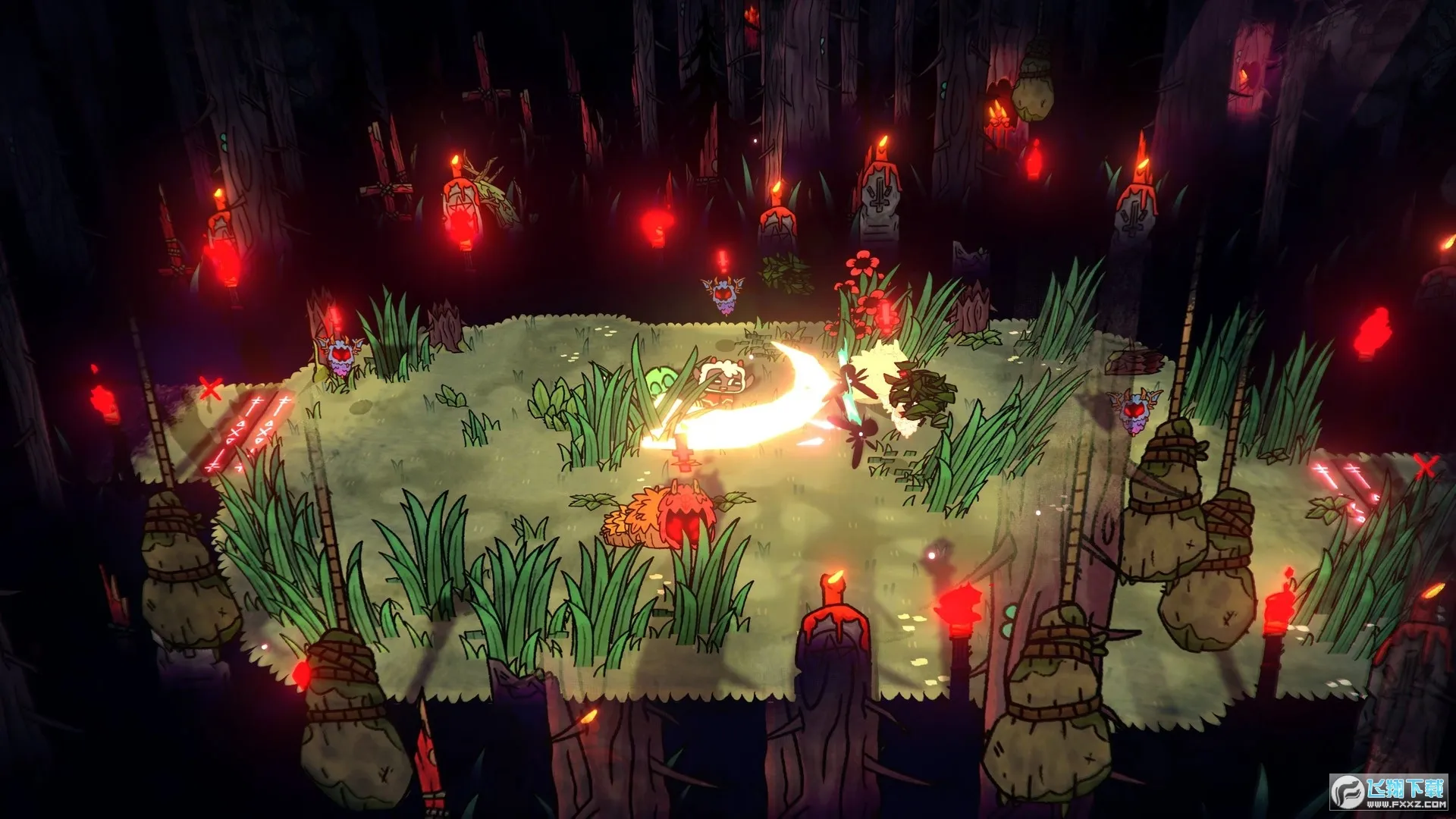 玩法融合度更高,Roguelike战斗与模拟经营无缝衔接。战斗中,进入随机地牢,用近战武器、咒术和塔罗牌对抗异教徒,每局能拾取临时增益,搭配天赋形成多样Build。经营方面,在营地建造各类设施,招募信徒并满足其需求,通过布道、仪式维持教派稳定。