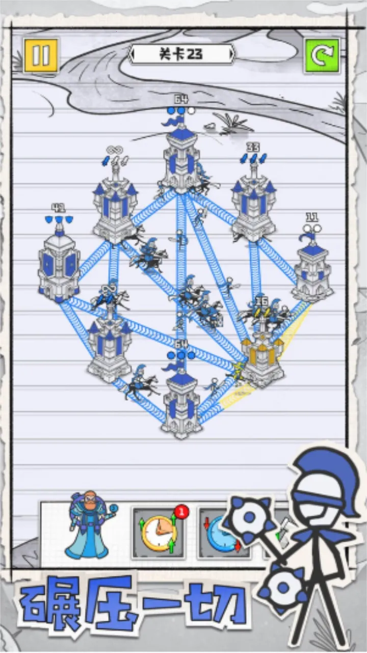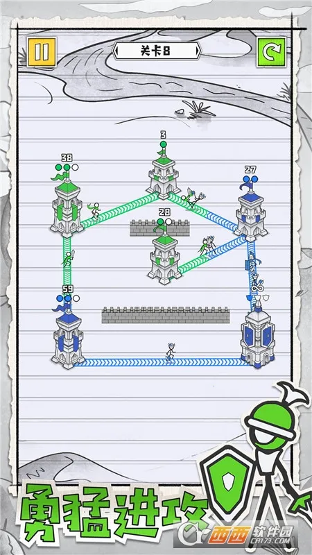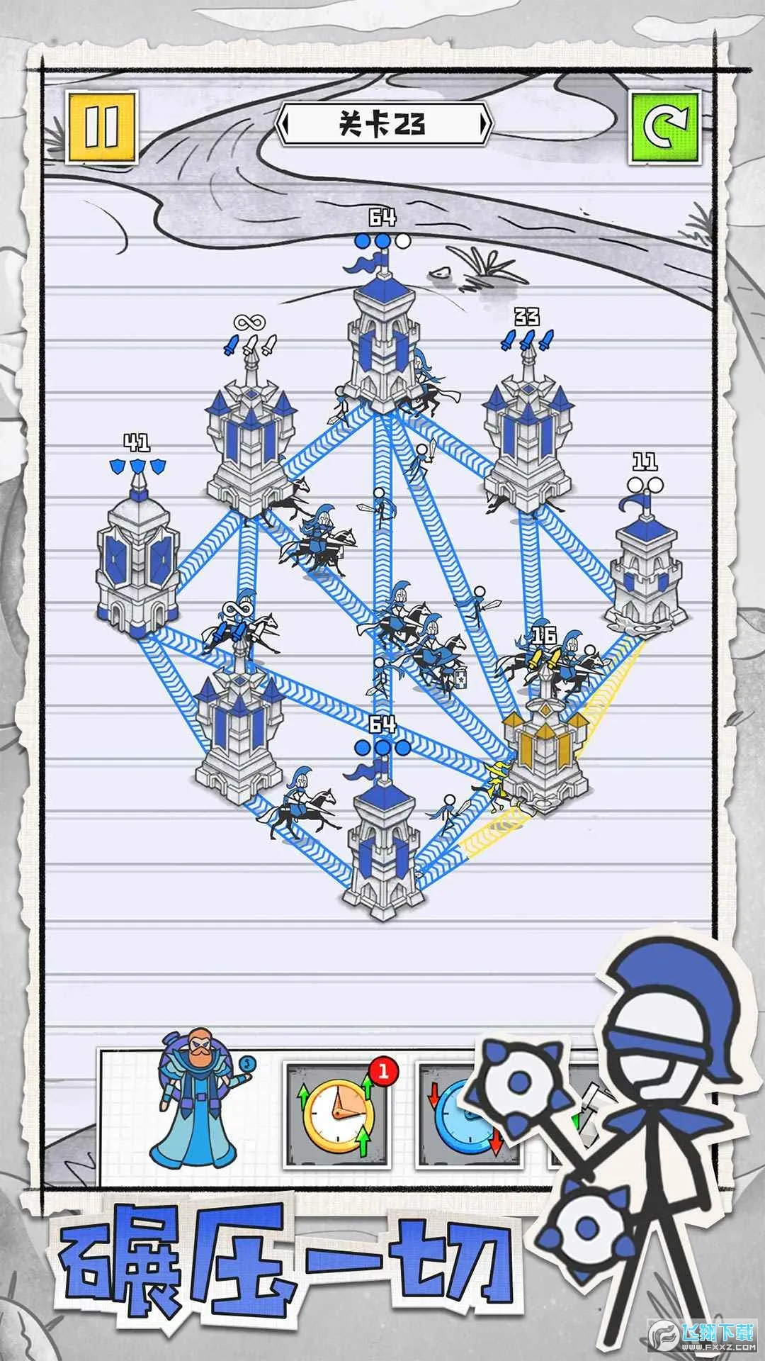 皇城攻防战2026最新版本是广州唯意科技开发的火柴人休闲闯关策略塔防游戏。玩家操作火柴人进行塔防战斗,拖动城堡连接占领,有多种关卡、兵种。特色是休闲好玩、画风简约、规则易上手,能锻炼思维、考验策略。