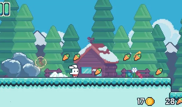 游戏画面采用像素风格,Q萌可爱,让人仿佛回到童年。操作简单直观,通过点击屏幕控制兔子跳跃,碰到障碍物会折返,利用这一特性可完成各种任务,比如解救被围困的小鸡仔。