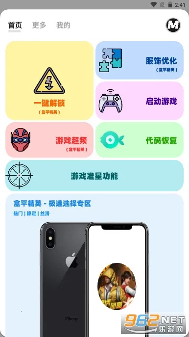 其功能强大,有一键解锁、服饰优化、游戏超频、代码回复等。操作方便,进入软件点击一键解锁,再选想要的画质,返回主页点击启动游戏即可。