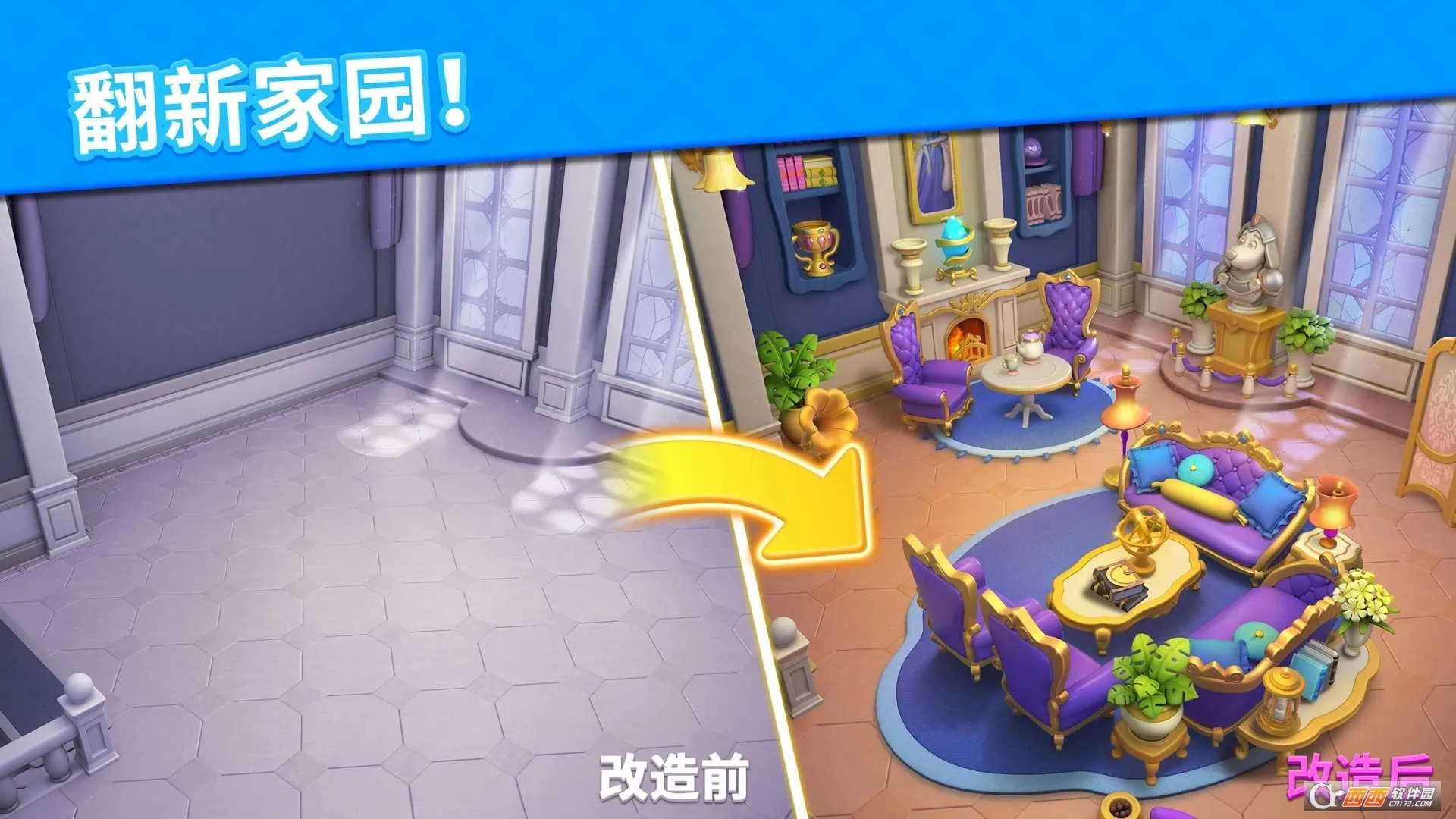 4、游戏提供多种风格场景,包括皇家客厅、许愿池、餐厅等,每个场景都有独特设计要求与挑战,还有三只萌宠在关卡中,喂养它们会回赠神奇道具,更有定期限时活动,能赢取丰厚珍稀奖励,带来多重区域探索并装饰全新区域等乐趣。