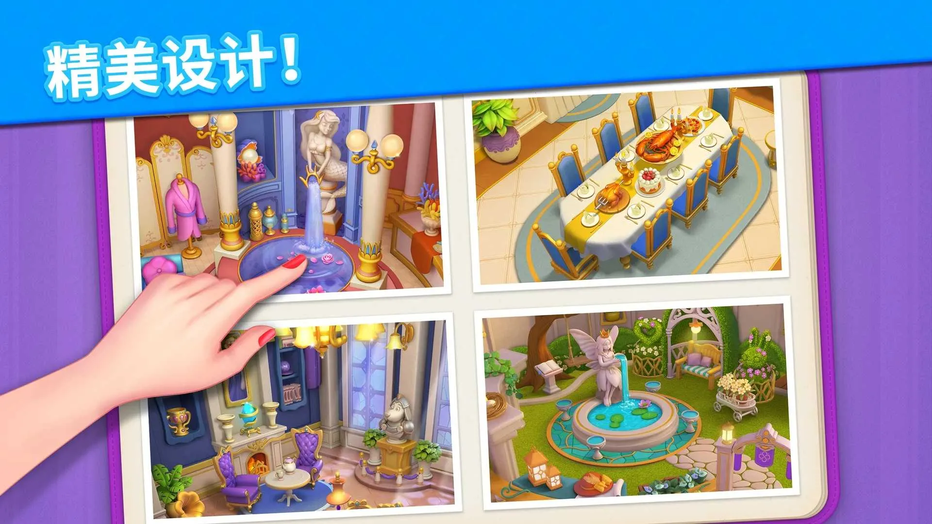 画面表现精美,多种风格场景如皇家客厅、许愿池、餐厅等,每个场景都有独特设计要求与挑战,充分满足玩家的设计乐趣。