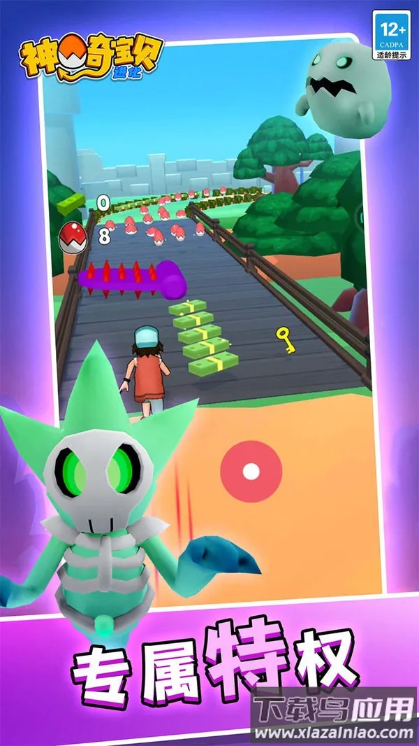 这是一款宝可梦主题跑酷游戏,操控角色在多彩赛道前进,收集道具助神奇宝贝进化。有多种玩法模式,还原小精灵技能,途中有特殊道具,要小心小型精灵,最终对决争夺最强训练师荣誉。