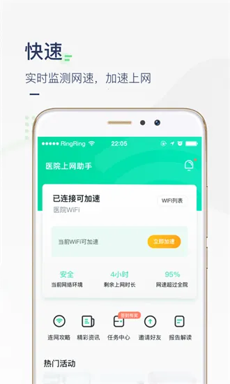 医院上网助手由禾连科技与各大医院联合打造,能为患者及家属提供安全高速免费WiFi。可智能搜周边医院WiFi一键连接,还有网速监控、自动连接等特色功能,助您在医院轻松上网,完成任务还能获奖励。
