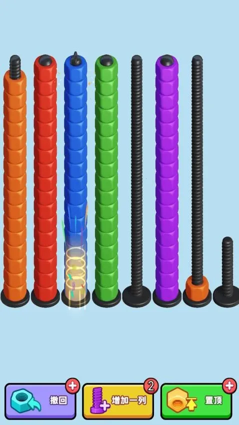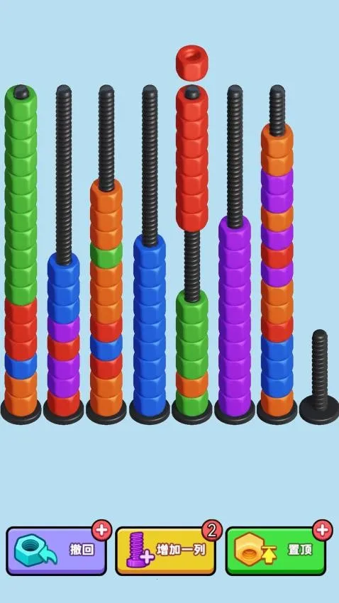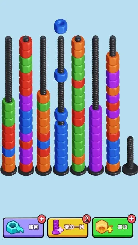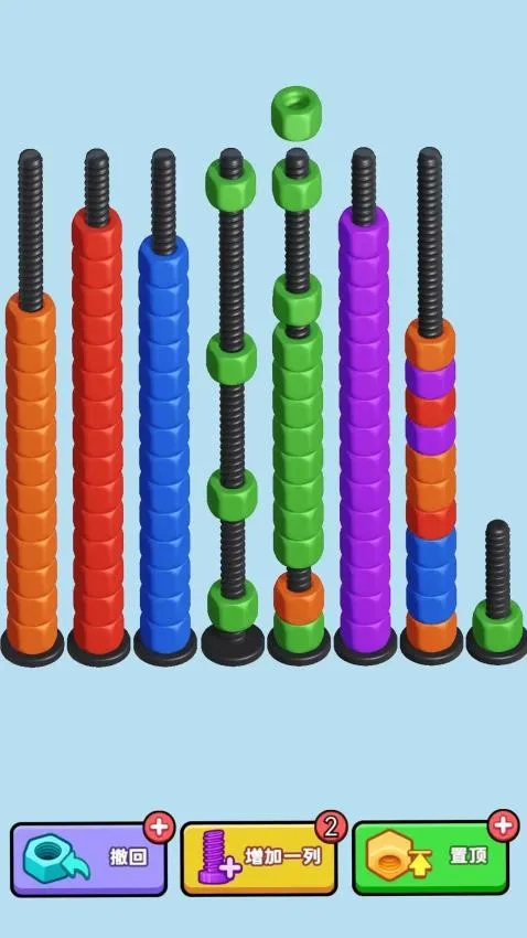 这是一款超有趣的休闲解压游戏。核心玩法是把相同颜色的螺母放置到同一颗螺丝钉上完成关卡。关卡中螺母颜色和数量各异,螺丝数量与之相同,玩家要找规律。移动一个螺母,相连同色螺母会一起动,操作方便。
