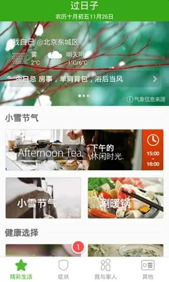 其一大特色是食材食谱功能,能定制当季新鲜食物推荐,给出最健康吃法,还依据体质测试结果,提供适合、需注意及不适合的食材。天气情况可展示自己与家人所在地天气,感受不同城市冷暖。关心家人板块能对关心的人分类并测试体质。节气风物则呈现自然与传统。