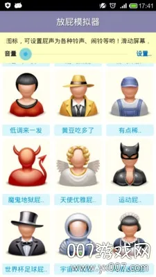 它的功能超实用。能模拟各类情境下的放屁声响,轻松营造欢乐搞笑氛围,在足球场、公交车或地铁等拥挤场合用它,能让周围人下意识让出空间。还能进入铃声通知或闹钟设置界面,随意选用喜欢的放屁音效当手机铃声,超魔性。而且操作简单,打开就能试听所有音效,通过拖动音量调节条自由控制声音强度,在连续播放设置页面能自定义音效重复次数。有了它,生活瞬间充满趣味,赶快下载,感受这特别的恶搞欢乐吧!