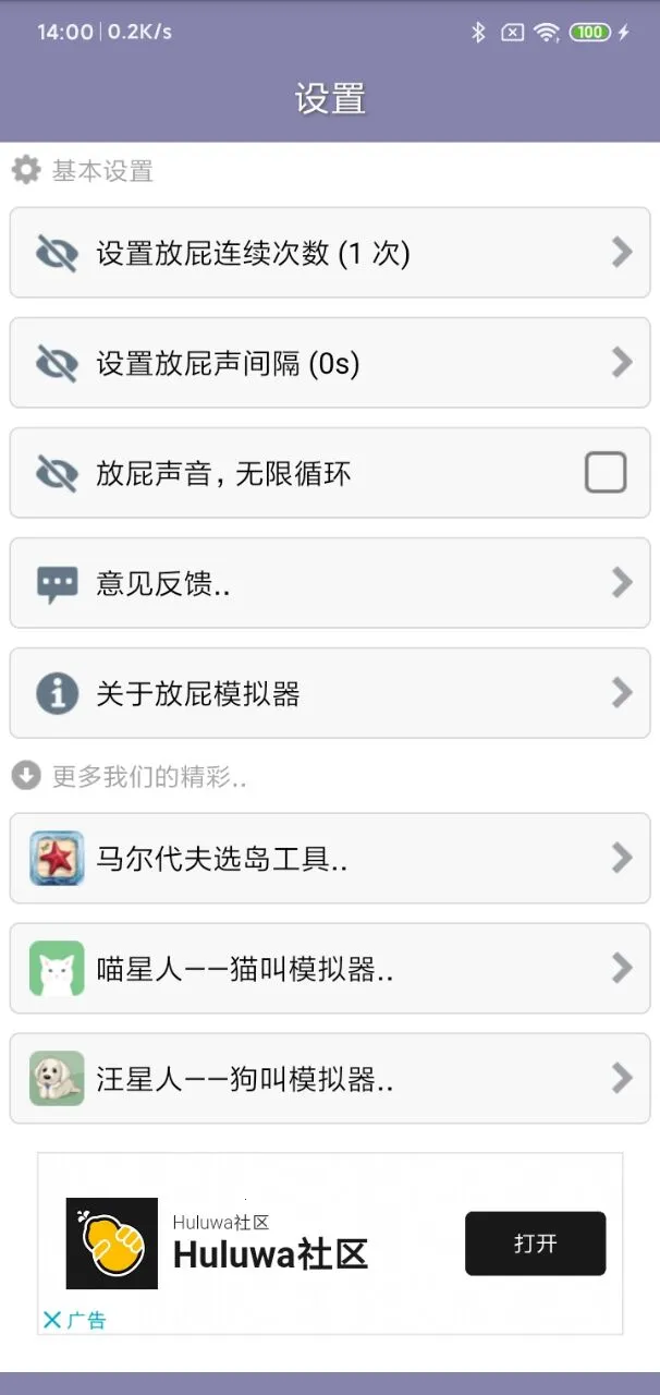 如果你想找好玩的放屁模拟器,那这款软件绝对值得拥有!它收录了超多风格迥异的屁声音效,像来自星星的屁、嘟噜屁等,每种都超有创意,趣味十足。能模拟各种情境下的放屁声响,不管是在足球场、公交车还是地铁等拥挤场合,突然播放这些声音,周围人常会下意识让出空间,超有意思。而且操作简单,打开就能试听所有音效,还能自由控制声音强度。你可以把喜欢的音效设为手机铃声或闹钟,用特别的声音唤醒每一天。它还有连续播放设置页面,能自定义音效重复次数。软件不断更新,新增了如天使也疯狂、唯美巴豆王、迷你旋律等音效,适配多种系统。总之,它就是一款能给你带来无尽欢乐,活跃气氛、适合恶搞整蛊的神器,让你随时随地享受声音恶搞带来的轻松乐趣,赶紧下载体验吧!