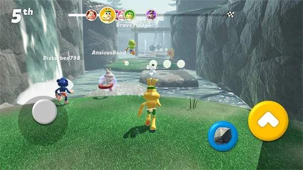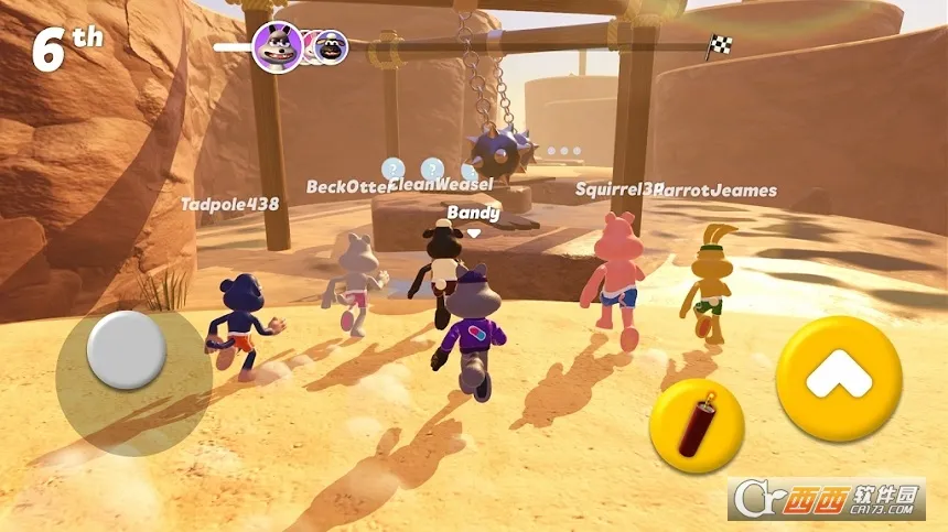 玩法上类似糖豆人,玩家在地图中闯关,操作简单,左边按键控制方向,右边按键跳跃。途中可捡道具干扰对手,还能在水中奔跑。每局时间短,利用琐碎时间玩很合适。