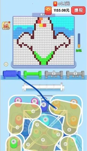游戏玩法是将不同颜色毛线合并消除,缠满毛线填满拼图。操作栏获取冒险后整理到对应颜色格子,完成整理绘制图片即完成挑战,失误可用道具补救。