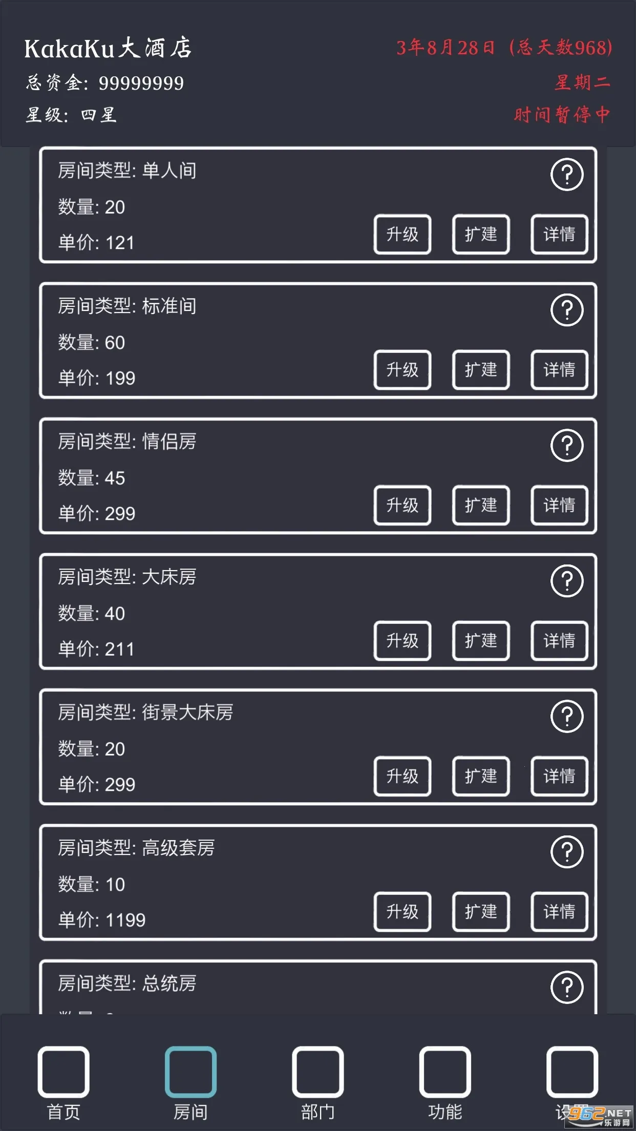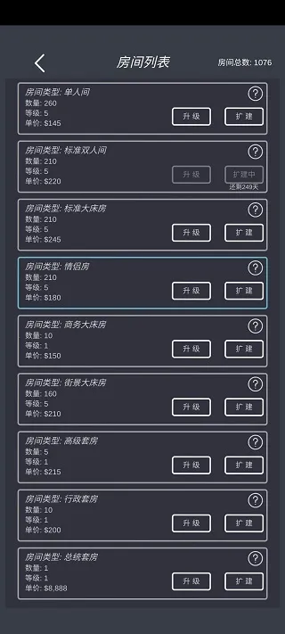 说说我的玩法,初期别开套房、高级大床、行政套房、总统套房,我三星了这些也住不满,然后走量的单人、标间、情侣、大床、街景等切记别升级太高,升级高了房价提升影响入住率,钱多了就慢慢扩张那些走量的房型。