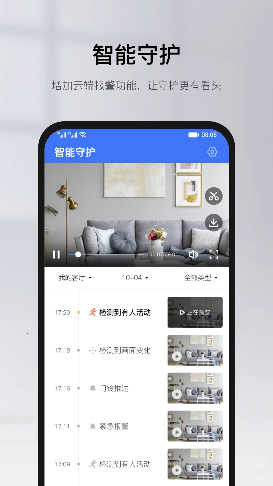 软件功能强大,支持远程实时视频监控,3步快速绑定设备后,就能手机实时查看并分享给亲友。双向通话清晰流畅,相隔万里也能边看边讲。自带多种报警类型,还能自定义添加外部传感器,异常动态时消息邮件及时推送。支持TF卡或云端录像存储,可随时记录关键镜头。