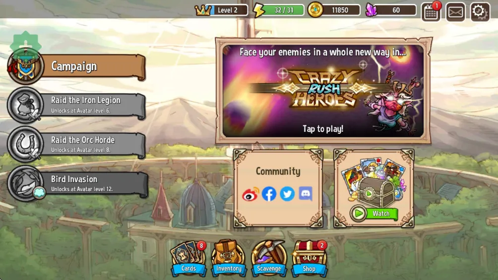 游戏关卡丰富多样,包含主线战役、无尽模式、限时挑战等,配合动态难度调整,保持长期可玩性。玩家还能解锁20位英雄,使用不同法术,如召唤飞龙、冻结敌人、治愈英雄等,增添战斗趣味。此外,游戏还有任务、家族委派等系统,具有成熟的冒险体系。