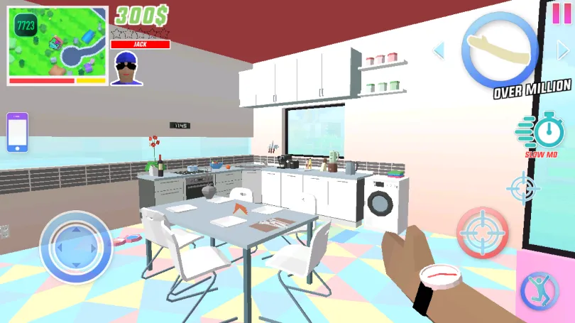 它的玩法多样,比如选择杰克进入游戏,点击右上角暂停看教程能更好上手。用左侧摇杆控制角色移动,点击手的图标换物品,随时能保存游戏。你能捡钱偷钱,玩迷你游戏和做特技赚钱买武器炸药。以第一人称视角,乐趣十足。