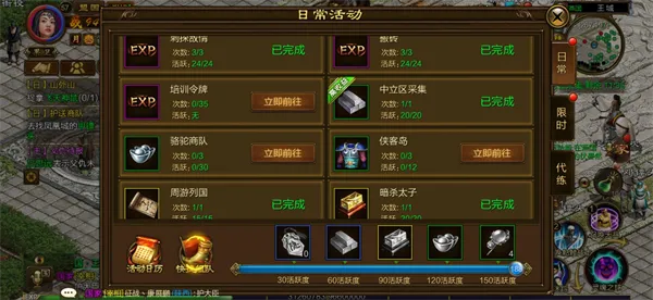 日常活动中有各种日常任务,中立区采集可以获得硬皮、秘银,周游列国奖励藏宝图有几率挖到硬皮、秘银,暗杀太子则可获得魂魄石,BOSS猎杀可获得秘银、硬皮、升级宝石。日常任务奖励的宝箱开启也有概率获得硬皮、秘银、魂魄石。完成日常任务会增加活跃度,达到一定活跃度即可领取秘银、硬皮、魂魄石、升级宝石奖励,日常任务每天一定要完成。