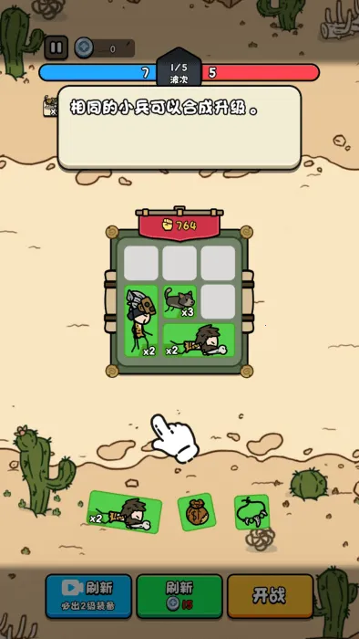 进入游戏,操作简单。将小兵拖入背包,放入后能看到士兵排列数量,合成越多士兵越多。刷新后可合成相同士兵,钱袋图标每回合获银币,项链装备能提供周边士兵增益效果,战斗全自动。