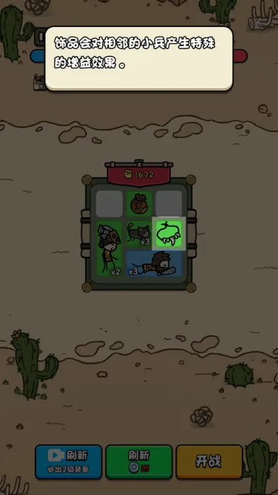 这是一款轻度休闲附带塔防模式的小游戏。游戏开局仅有一个小破烂,玩家通过合理操作养成内容来通关。将小兵拖入背包,合成相同士兵可增加数量,钱袋图标每回合获银币,项链装备能提供增益效果,准备好后战斗全自动进行。