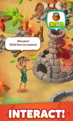 游戏核心玩法是物品融合。匹配相同物品创造石器时代工具,每次融合解锁新资源升级和生产链,推动村庄繁荣。收集资源制作工具,修复小屋、扩建农场,让营地蜕变。