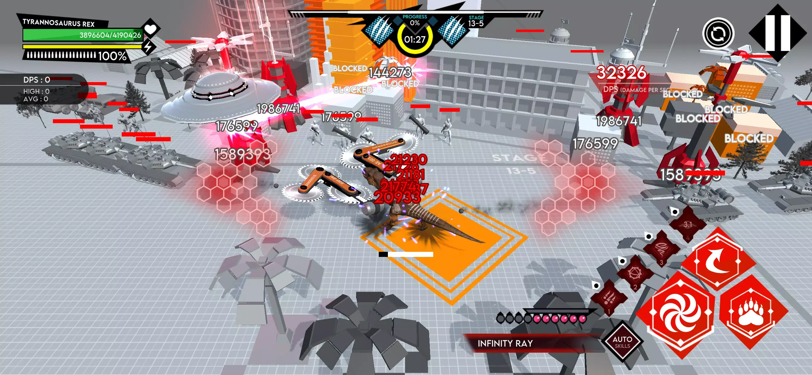 这是一款动作感十足的模拟游戏,背景设定在混乱的恐龙宇宙。玩家操控基因强化的机甲恐龙霸王龙,在充满色彩且可破坏的3D城市中尽情破坏。游戏玩法丰富多样,奔跑冲撞粉碎城市建筑,释放强大机甲火力,还能与敌军展开机甲战争,包括士兵、装甲车辆、坦克、直升机及致命防御塔等。狂暴行动玩法中敌军不断出现,UFO支援与灾难级技能更是让破坏效果升级,如召唤UFO盟友、释放强力激光、召唤陨石雨等,能瞬间改变战场。