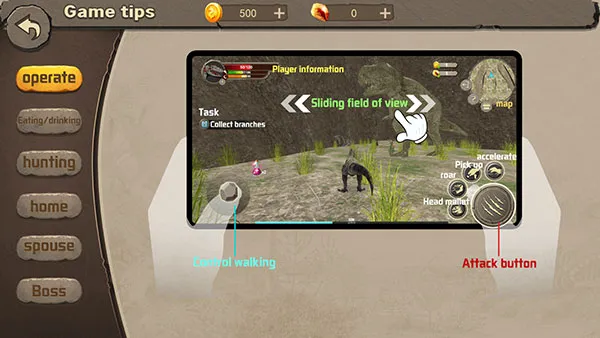 1、进入游戏,我们滑动屏幕可以看视野,左手变按钮控制走动,左上角是恐龙的状态,右上角是地图以及所在位置,右手边大按钮为攻击,其他分别控制头槌、咆哮、叼起、加速;