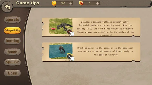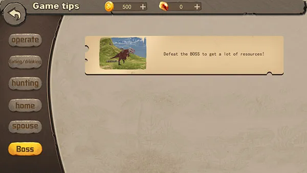 3、第一张图表示状态,可以通过攻击减少猎物的血量,但是也一定要注意猎物的攻击,不要被反杀,请时刻关注恐龙的状况,第二张图表示进攻时会显示敌方信息,注意敌人血量,当心boos级别的敌人;