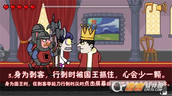 趣味关卡与轻松体验:挑战各式趣味关卡,在不同刺杀场景中收获欢乐,轻松释放压力,享受愉快游戏时光。动漫风格场景搭配沉浸式剧情对话,小心潜伏的敌人突袭,朝着成为国王的目标不断前进。