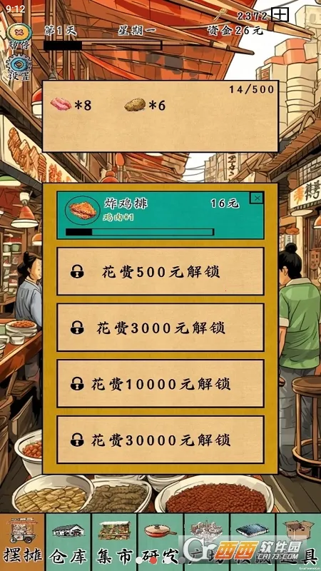 想在一百天内成功摆摊赚钱?那就来试试这款超有趣的游戏吧!它以中华各地特色小吃为主题,让你体验当小摊主的经营乐趣。游戏玩法多样,有创意十足的摆摊经营和股票交易结合模式,还有轻松幽默的氛围。你能解锁新食谱,根据配方选择最优售卖组合,比如一开始卖烤面筋和土豆片赚快钱,再开新售卖位。攒钱过程中,周二的厨艺比赛别错过,按田忌赛马方式参赛能捞一笔。三十天后可炒股,推荐茅台、顺风汽车等股票。这里能满足你对摆摊赚钱的所有想象,不仅能让你感受到浓浓的中国传统风味,还能体验日入斗金的快感。操作简单又自由,还充满各种小细节,每道菜谱都有故事。快来下载,开启你的摆摊赚钱之旅吧!