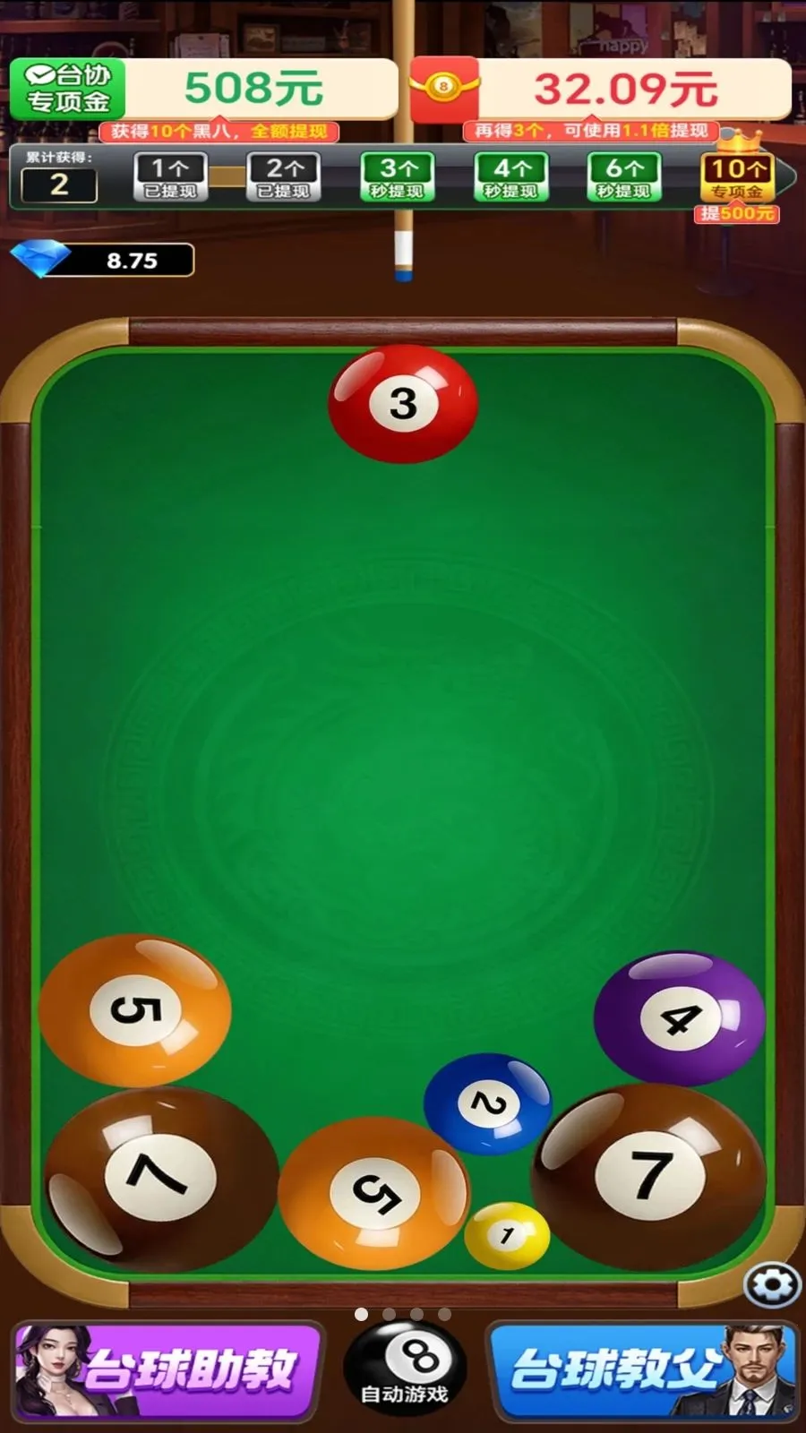 富贵台球是一款有特色的游戏。它属于益智类台球合成游戏,能让玩家在合成台球过程中获取红包奖励。合成黑八更有额外收获,且合成黑八数量越多奖励越丰厚。黑八还具备升级角色的功能。新版本上线带来新体验。整体而言,在玩法和奖励设置上有一定吸引力,能给玩家带来独特的游戏感受,想要赚钱的玩家不妨一试,在享受台球合成乐趣的同时还有机会获得红包收益。