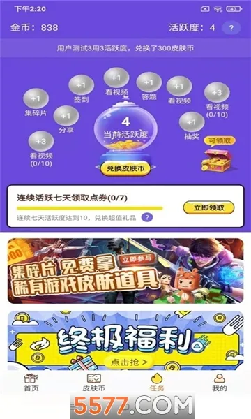 2、获取轻松:提供多样领皮肤途径,任务丰富且简单易懂,如答题、签到、看视频、幸运大转盘等,能快速获取皮肤币,轻松领取多款皮肤。