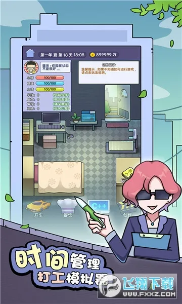 游戏有着丰富的设定。设立了心情、精力、健康等生存属性,挣钱时需劳逸结合;提供4个种类、20多个专业学习课程,玩家可随意学习;有24种不同工作供玩家选择;玩家要在有限时间内合理分配学习、工作和娱乐,以赚取更多资金。