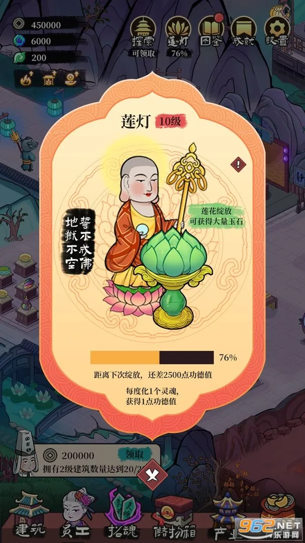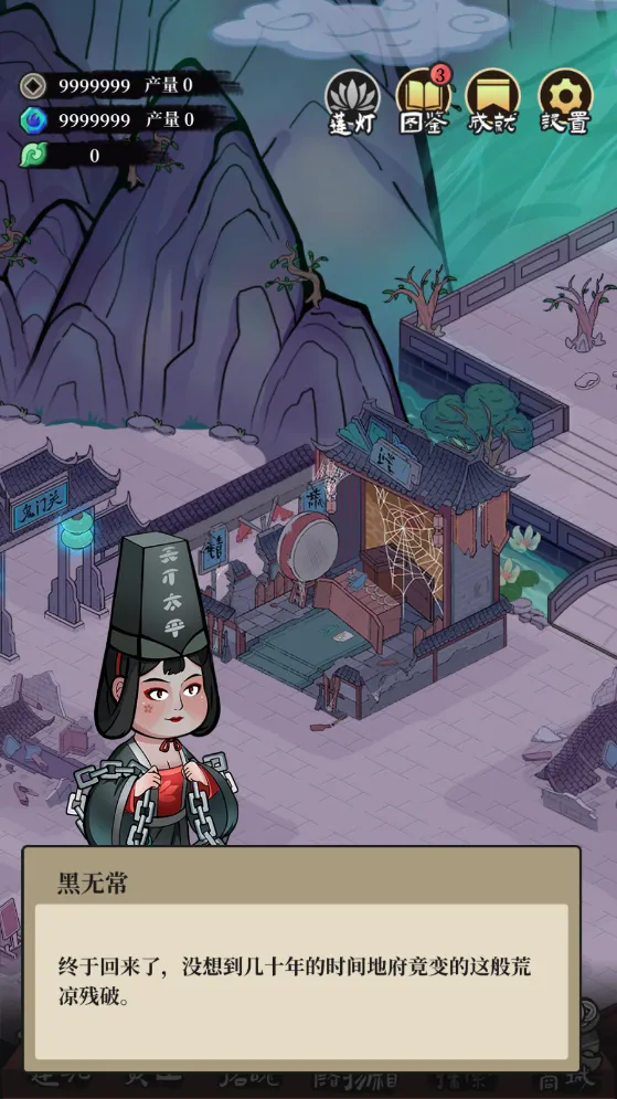 游戏采用卡通国风美术风格,画面精美,为玩家呈现出一个独特的地府世界。玩法轻松简单,以建设经营为主。玩家能建造如阎罗殿、鬼门关等富有中国风特色的建筑,不同建筑属性和能力各异,对应不同灵魂审判场景。还可招聘黑白无常、牛头马面等神话人物协助管理。通过帮助鬼魂净化罪业,使其解脱,玩家可获功勋,莲灯随之成长,绽放时带来丰厚奖励。同时,点击地狱类建筑上方气泡收集魂币,可用于升级阎王殿和购买特殊物品。
