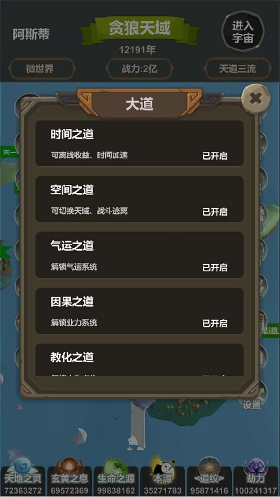 1、题材新颖独特:融合修仙与模拟经营等元素,让玩家扮演天道掌控世界,体验开天辟地、主宰众生的快感,带来全新游戏感受。