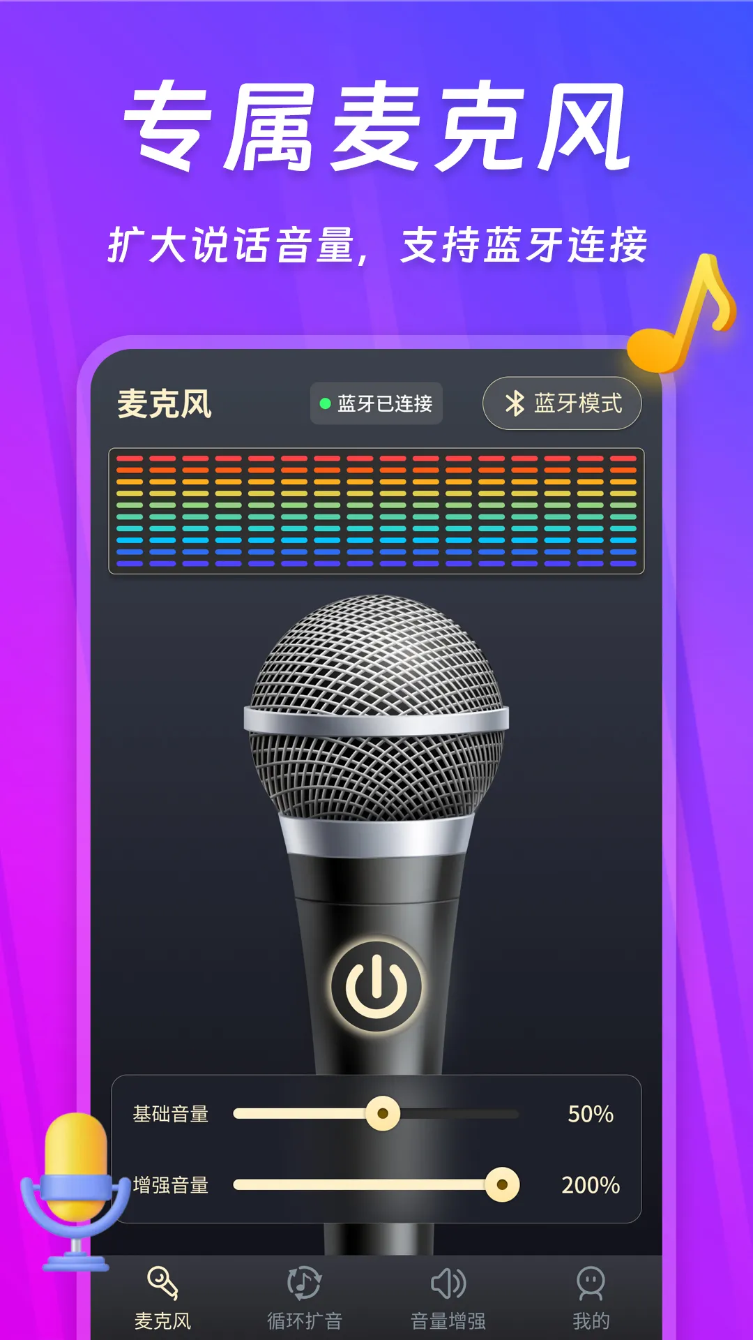 话筒扩音器是手机麦克风扩音软件,支持蓝牙连接,无需额外硬件。能自定义音量、录制循环播放,模拟音箱。有多种专业音效,适用于会议、演讲、K歌等场景,操作简单,音质高保真 。