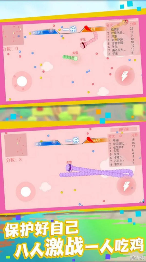 玩法上,操控简单易上手。进入游戏先创建昵称,选好模式与角色后,通过屏幕左下角圆盘控制贪吃蛇移动方向。吃掉彩色小圆点可使蛇身变长,长按加速键能快速移动,利用走位让对手蛇撞到自己,就能吃掉对方残骸壮大自身。蛇头碰到其他蛇则死亡。