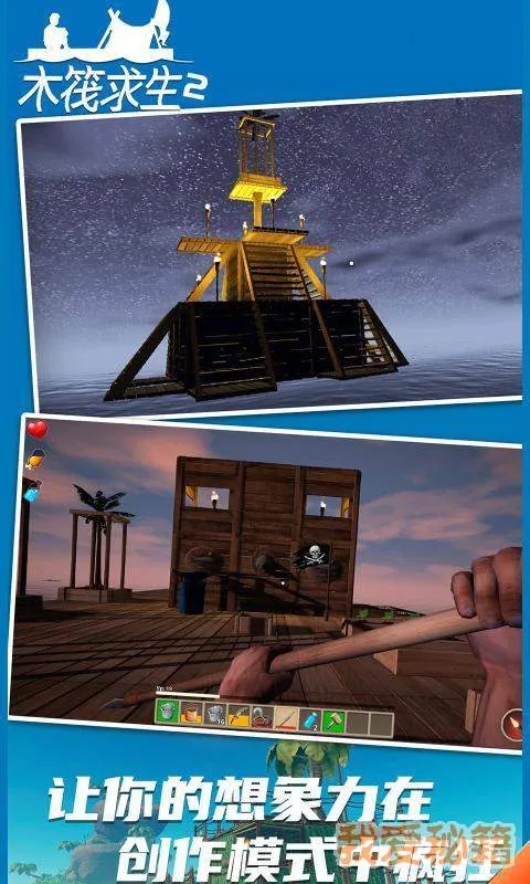 此外,游戏有生存和创造两种模式。生存模式有三种难度,玩家要保持健康、采集资源、扩大地基、创建道具;创造模式资源无限,可自由建造,没有鲨鱼攻击,乐趣十足。喜欢冒险生存类游戏的玩家不容错过。