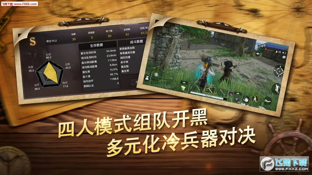 3、多元竞技模式:经典四人模式可组队开黑,使用多元化冷兵器对决,还有陆战海战融合,带来不同竞技感受。