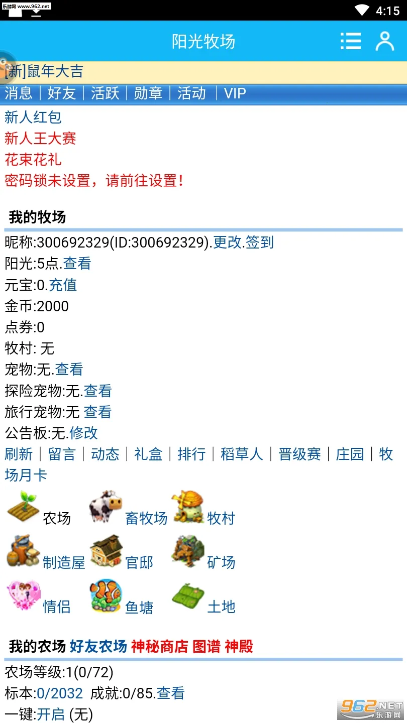阳光牧场是一款牧场题材经营手游。玩家扮演牧场主,管理日常、种植作物、养殖动物,能与好友互动偷菜。玩法丰富,界面清新,操作简单,以文字图片为主,带你重温偷菜时光,享受悠闲牧场生活 。