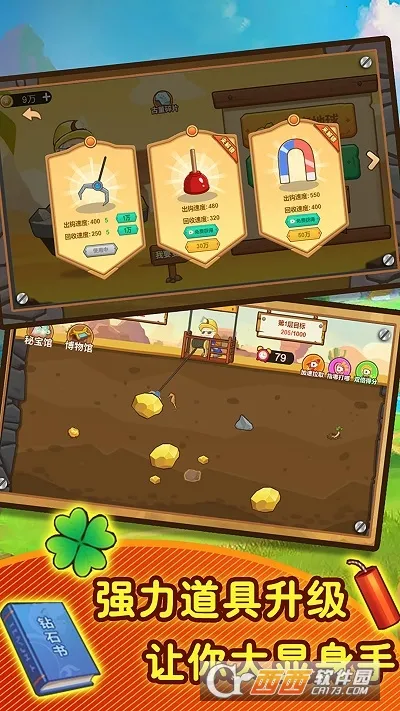 玩法上,用钩子抓物品得分。钻石值钱,金块越大越值钱,石头是障碍物要避开,炸药桶触碰会爆炸。还有移动迅速的小猪要抓。此外,布袋藏随机道具,骨头不值钱,生力药剂加快收钩速度,石头、钻石收藏书分别提升对应物品价值,幸运草能从布袋获取更好道具,都在一局内有效。