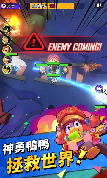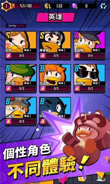 1、独特鸭子组合:游戏中可招募各种不同技能的鸭子,每只鸭子都有独特技能和特点,玩家能根据自身策略选择合适鸭子组成强大队伍,体验不同组合带来的战斗乐趣。