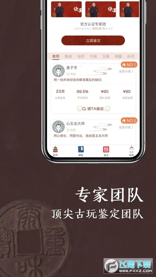 1、权威专家团队:行业专家、知名鉴宝大师、资深玉石行家、专业古玩鉴定师等坐镇,国家大师具备专业资质,在线实时鉴宝,鉴定结果更专业可靠,还能带你学习古玩玉石鉴定知识文化,与大师专家零距离交流。