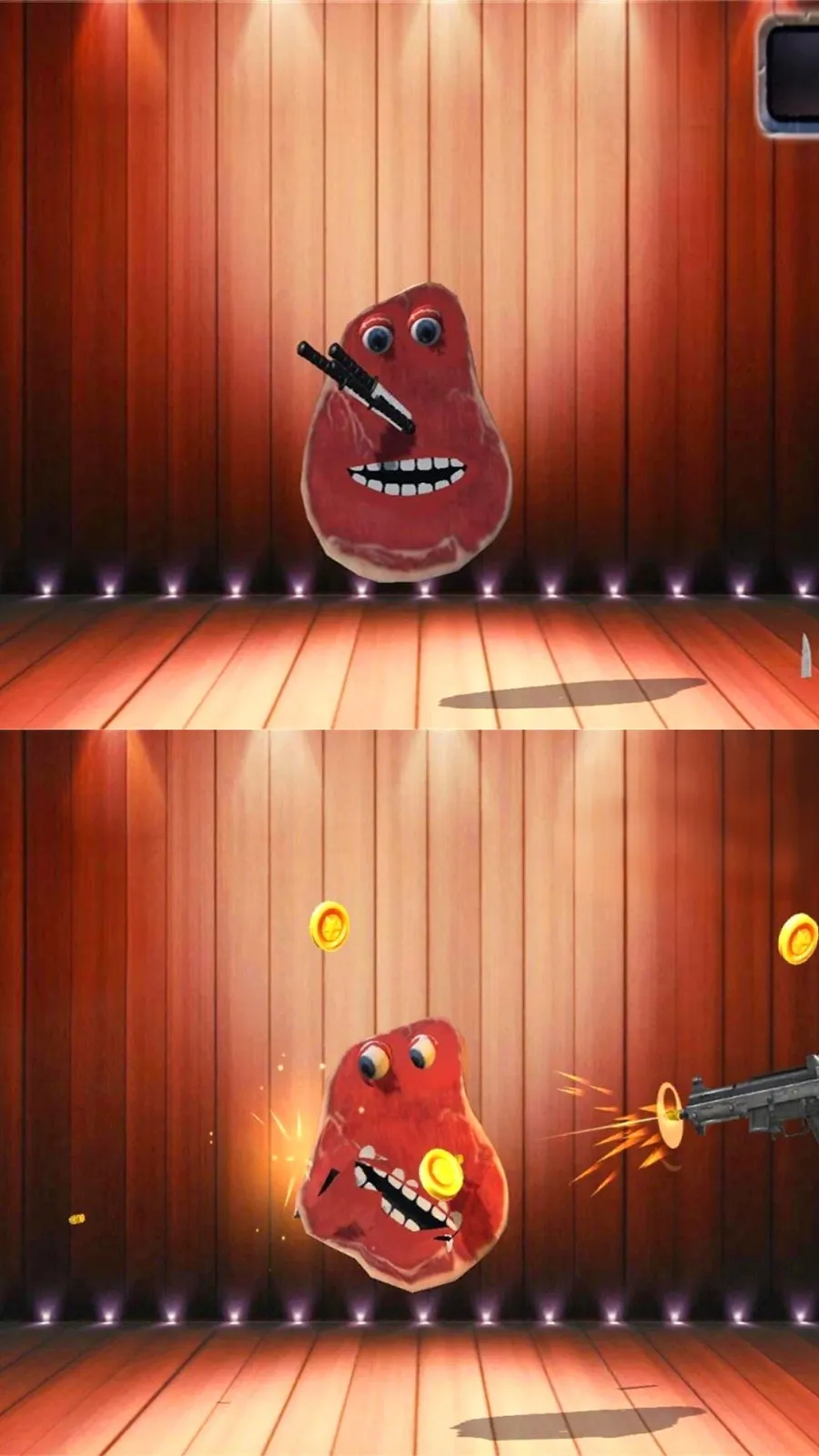 《料理餐厅模拟(牛排烹饪游)》是一款以牛排为主题的创意恶搞游戏。进入游戏后,玩家会看到各种食材,先处理动画牛排,初始用厨刀,滑动屏幕控制切割,积累金币可解锁特制厨枪等厨具。